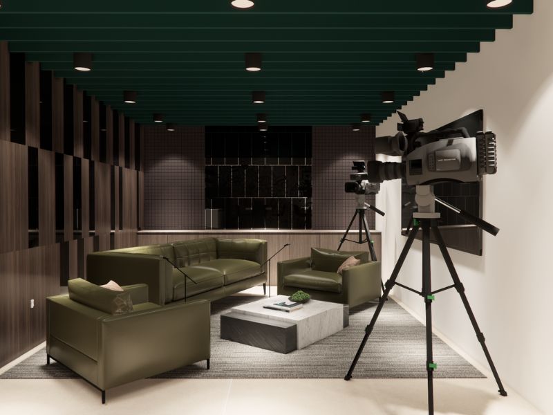 Podcast and recording room with soundproofing, equipment setup, and aesthetic design.