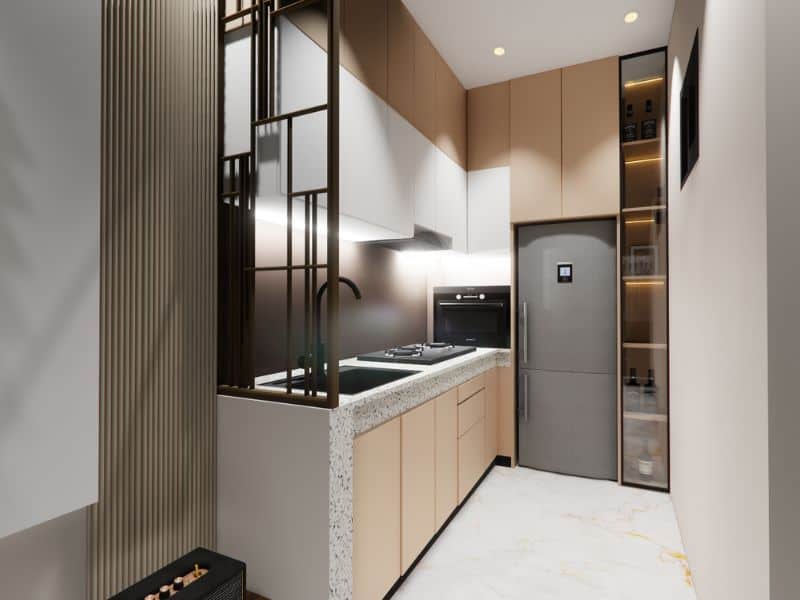 Modern modular kitchen with optimized storage, sleek cabinets, and functional workspaces.