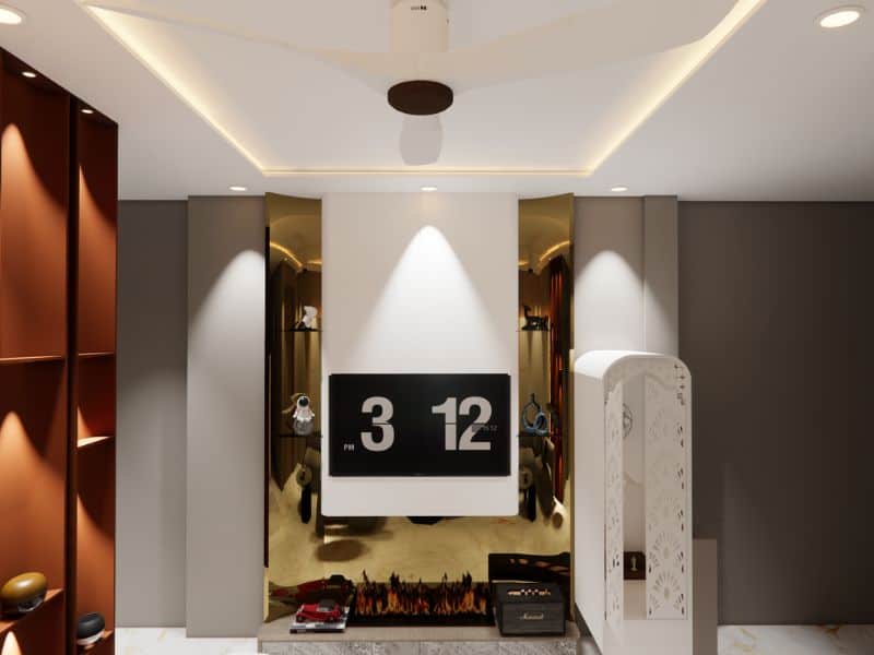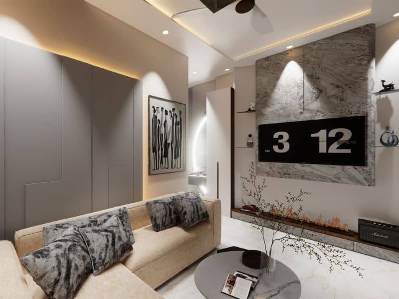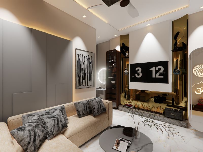 Living room design with modern furniture, ambient lighting, and functional layout for family comfort.